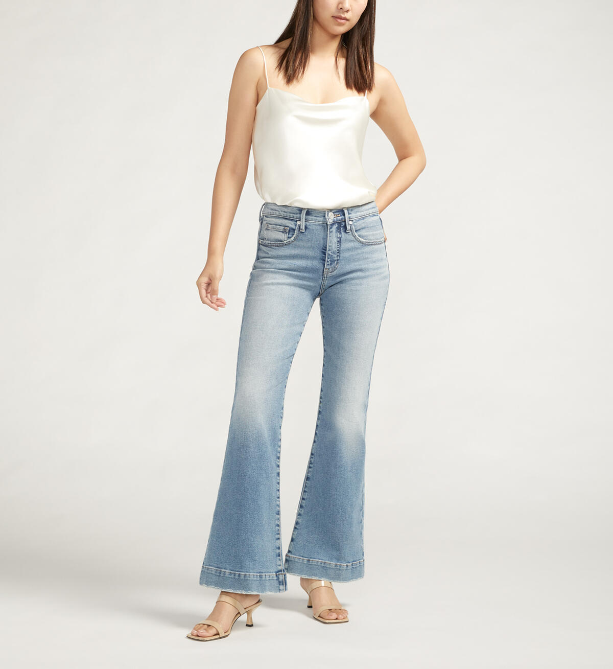 - Flare jeans with a medium indigo wash and thick finished hem, 5-pocket styling, a zip fly and button closure