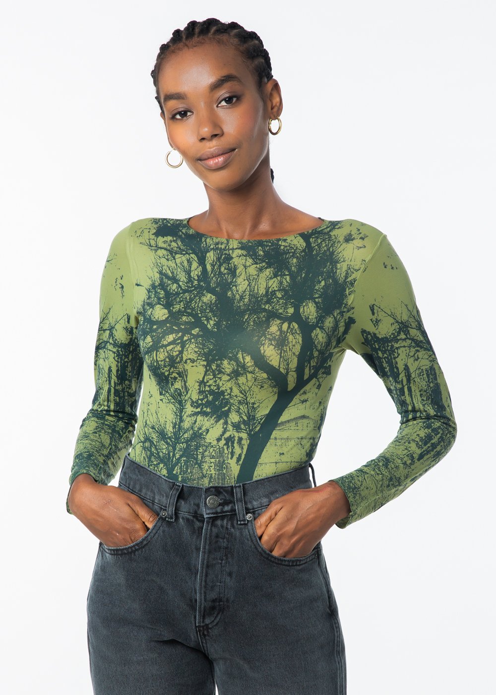 Semi sheer long sleeve top with raw cut edges and higher neckline