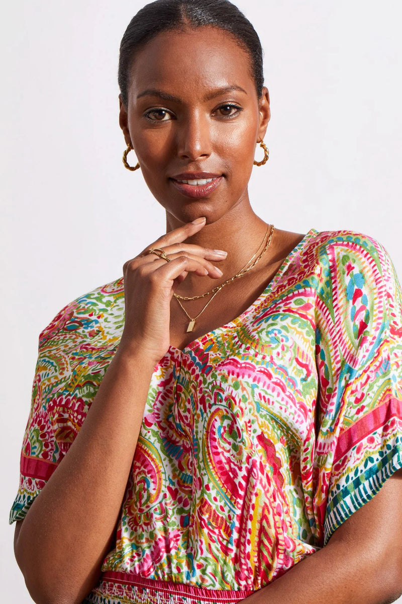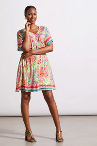 Add a rush of color to your collection with this v-neck dress featuring border prints and flowy dolman sleeves. We're also loving the additional waist accent and the functional back-of-neck opening.