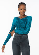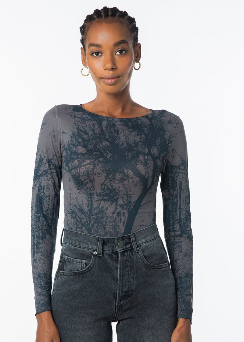 Semi sheer long sleeve top with raw cut edges and higher neckline